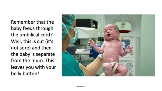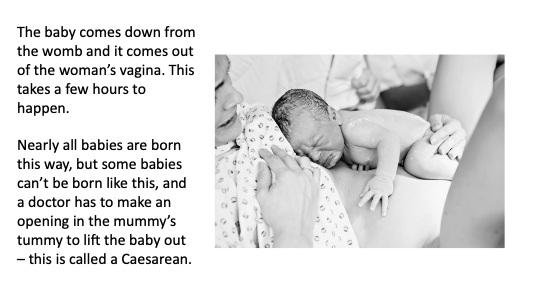When you talk about pregnancy you can share the main points as follows. We have provided some pictures here to go with the words you can use.You can go back to the pictures and text again and tell the story of pregnancy and being born. As always, there are book suggestions later.