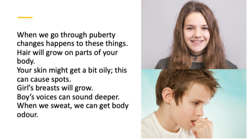 Talking together, answering questions as best we can, can help make sure we are responding to the curiosity or the worries that children might have about puberty. You can use these images and text to talk together about puberty over many chats.